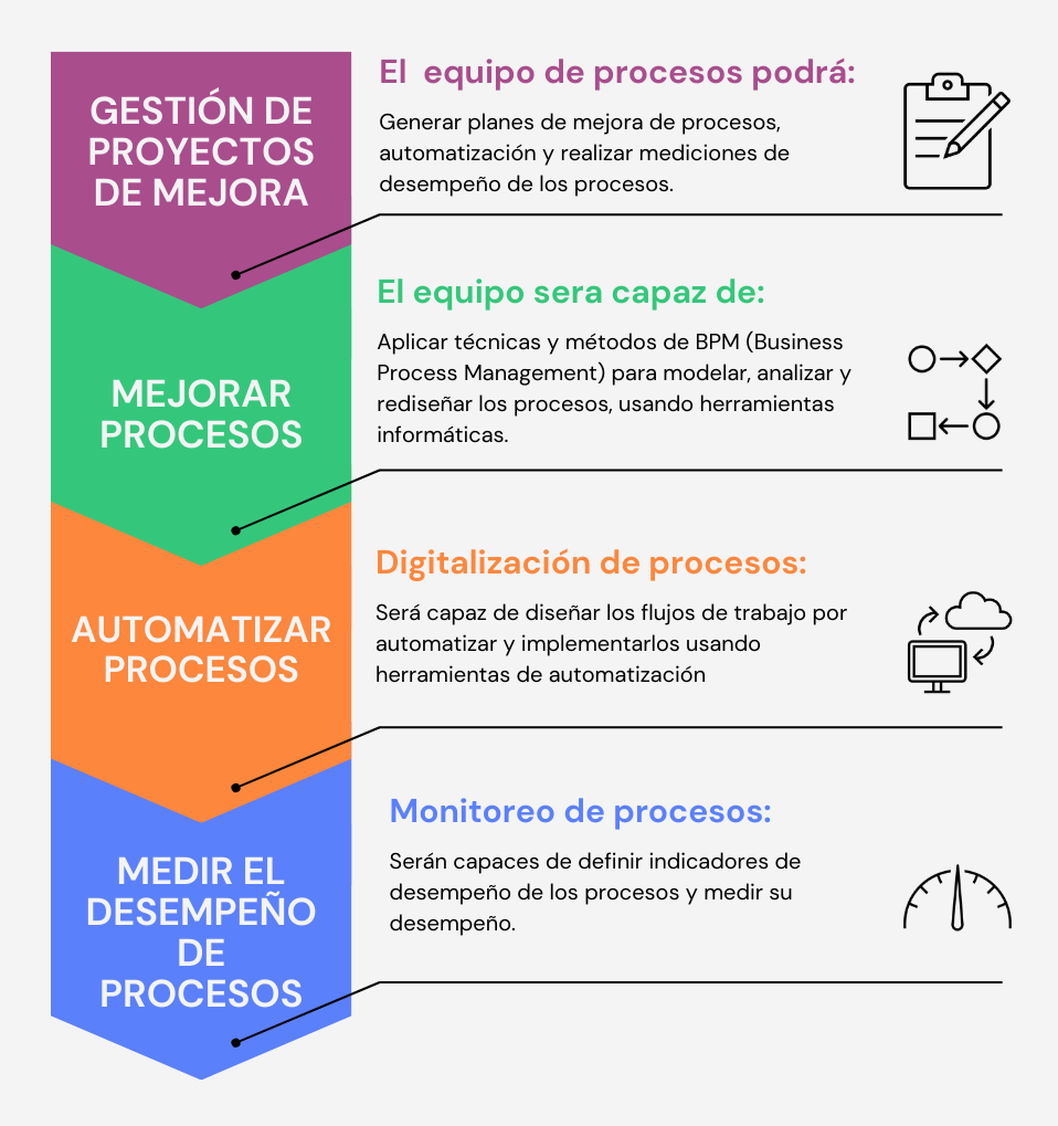 Brindamos asistencia en el fortalecimiento de las capacidades de la empresa para la gestión por procesos con BPM. Al mejorar estas competencias, la organización podrá adquirir capacidades sólidas para la gestión por procesos y la mejora continua, lo que puede resultar en una mayor eficiencia, calidad y alineación con los objetivos estratégicos.