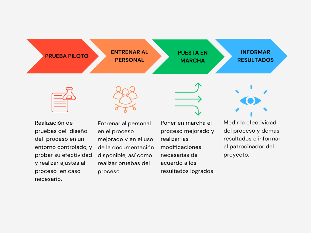 Implementamos los cambios planificados de los procesos durante las fases iniciales de análisis, rediseño y transformación digital, tras proporcionar capacitación y asesoramiento al personal.
